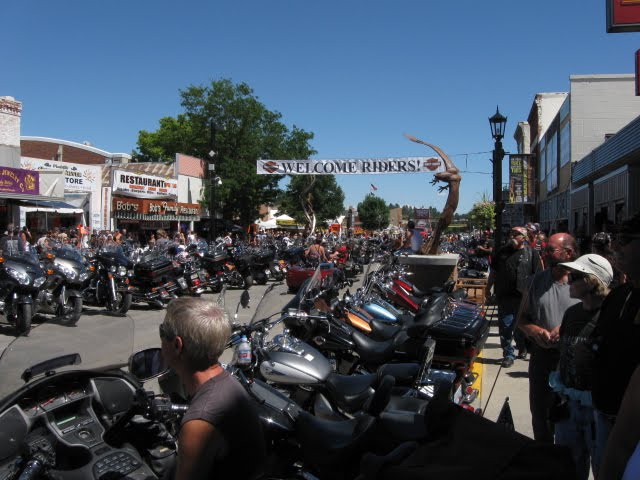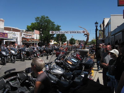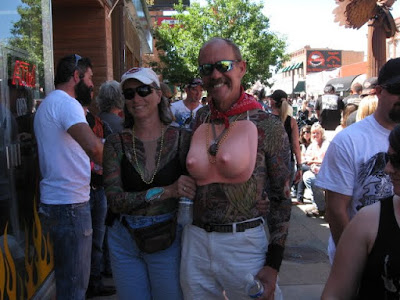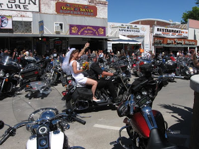 At last we're in Sturgis, on a blistering 95 degree Tuesday morning. The town jumps, bikes are everywhere, and the characters are out in force. These photos need no explanation. The whole town is one big party for a week. Bought our souvenirs and hit the road.