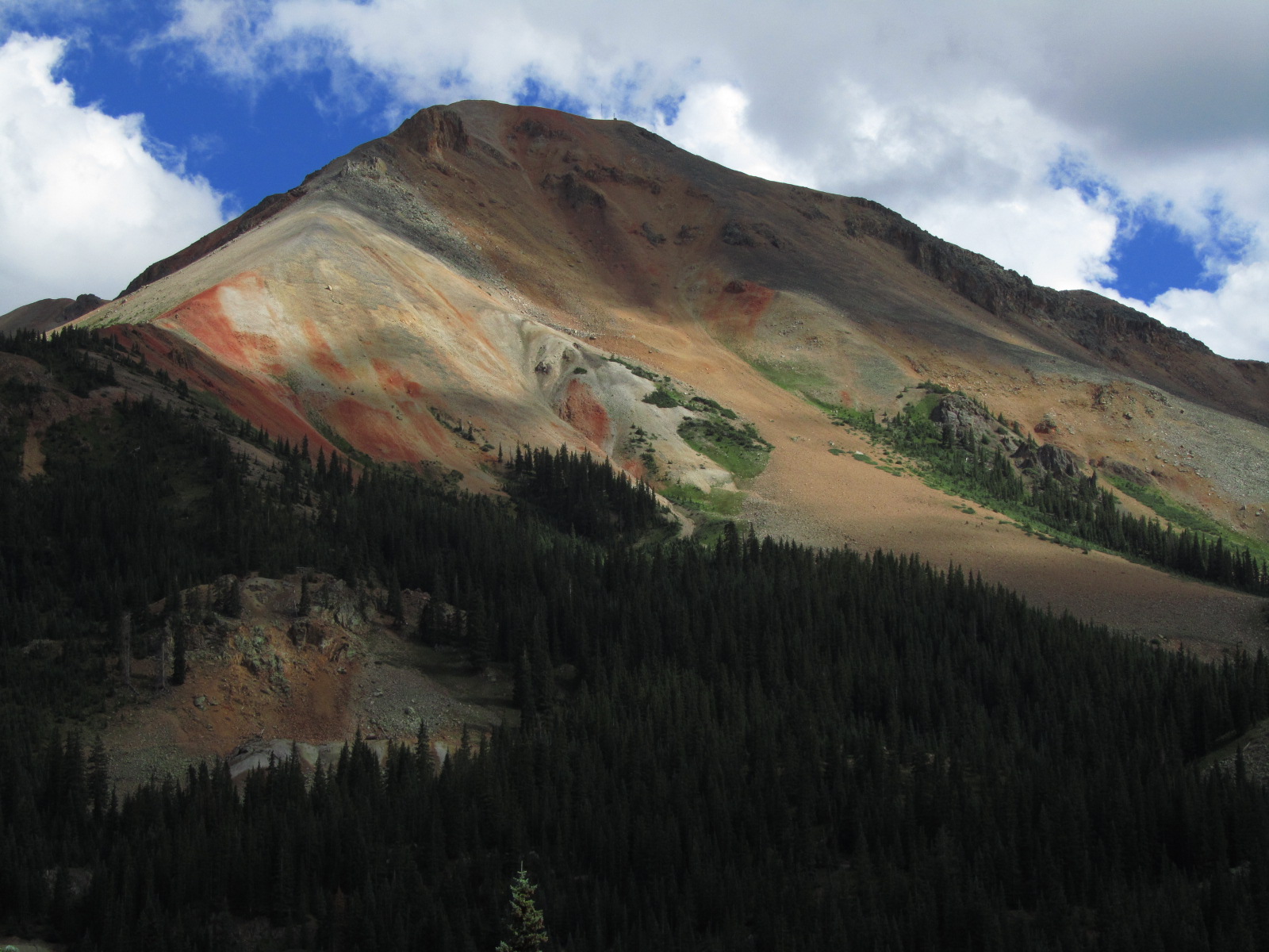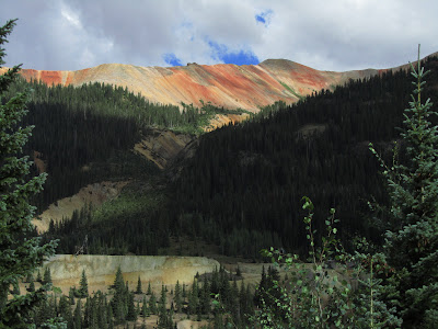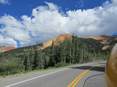 Riding south on US 550 we pass through the town of Ouray, one of many natural hot springs in Colorado. Between Ouray and Silverton we'll ascend to 11,000 feet in the Red Mountain Pass. Silver mines opened up this country, which may explain why this stretch of road is known as the "Million Dollar Highway." Riding closer to these mountains the shades of red change with the sunlight and the strata. Still more astonishing geology as every mile goes by.