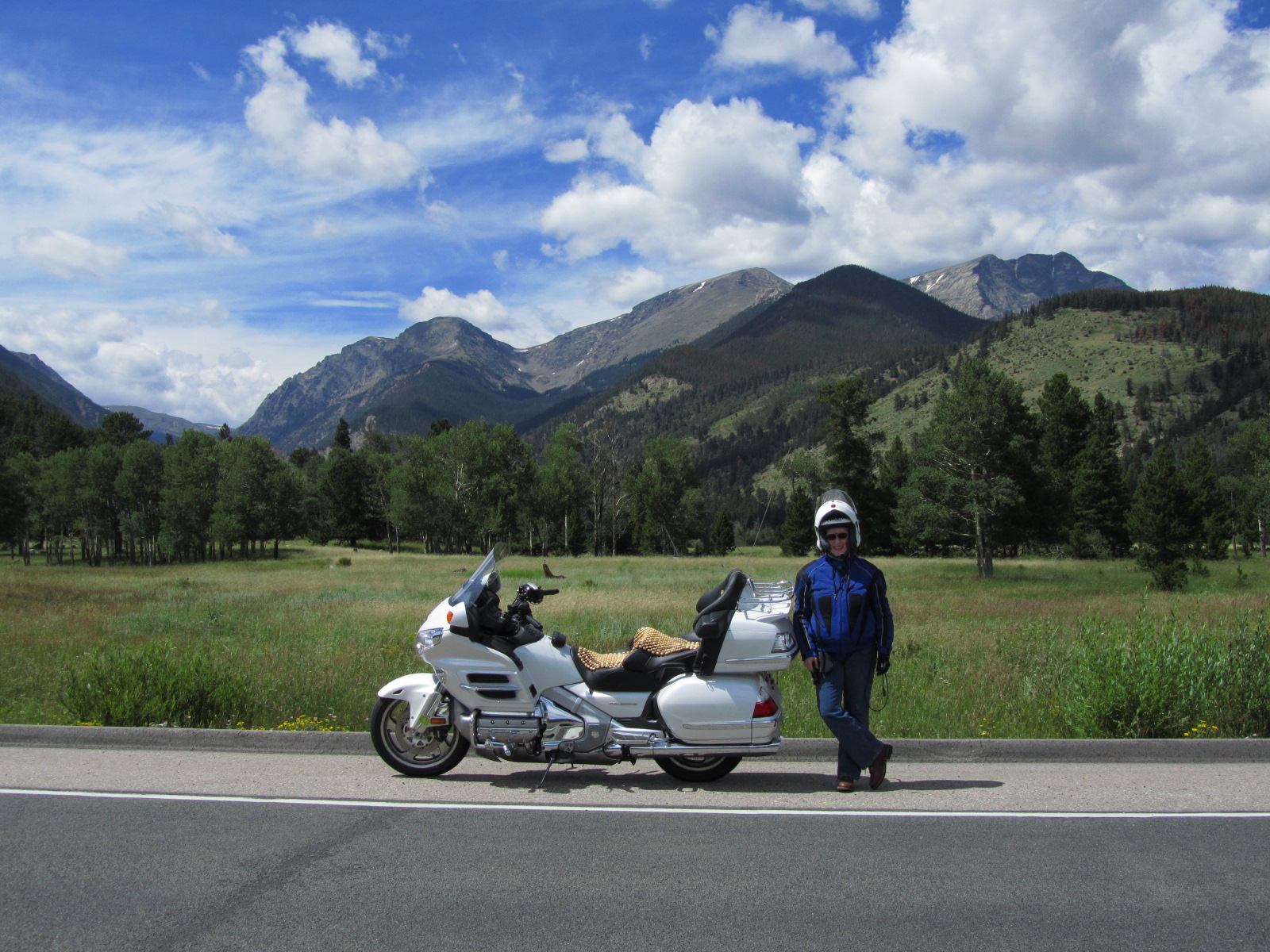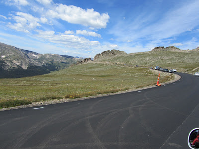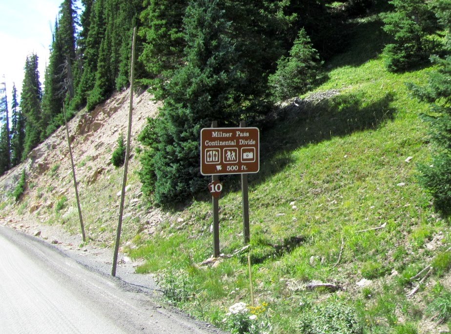Rocky Mountain National Park is our second major destination on this trip. Mountains are vast. The views are spectacular. Altitudes range from 7000 ft above sea level, to >12,000 feet. Roads wind around peaks, across saddles, overlook valleys, to rise above the tree line into high country tundra. Just after entering the park we stopped for pictures. Riding farther into the park we discovered that road construction was holding up traffic for significant amounts of time. Dozens of cars would line up waiting for the signal to ascend. With gorgeous weather we rode up the the Alpine Visitors Center and beyond, crossing the Continental Divide at Milner Pass.