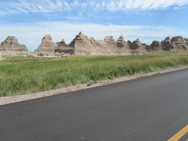 Soon, signs signal our approach to the Badlands of South Dakota, so named not for desperados, but for the French explorers who though them "bad lands" for their lack of water. Eroded out of deep sediments from the ocean that covered the western US 60 million years ago, these jagged, pointed, encrusted canyons offer up a severe beauty in the sun.