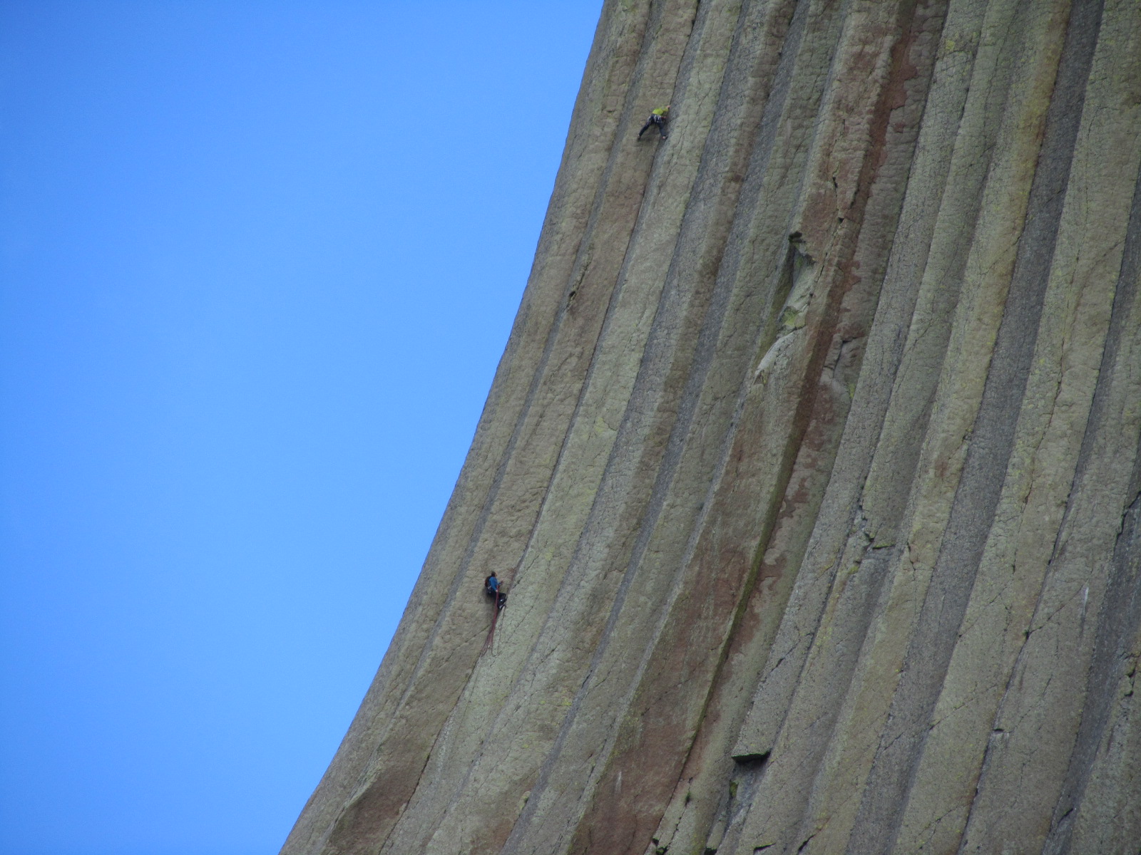 Barb and I reached DT in the afternoon, and posed for pictures. First Barbara, who was impressed and excited to be there. Then me, having a second close encounter with the artist's work. Since the weather was changeable, we decided to hike the easy loop around the tower's base. In the space of an hour we went from sweating to dodging chilled raindrops. There were at least 8 climbing teams on the crevices that day. My telephoto picked out one pair, about half way to the top. As luck would have it, the battery in my camera died shortly thereafter, so, dear readers, you're spared my observations on rock climbing then and now. I did ask a couple of National Park Rangers if they had ever encountered any aliens on the premises. One replied that there were strange happenings at night. Glad know somebody's keeping watch, I told him.